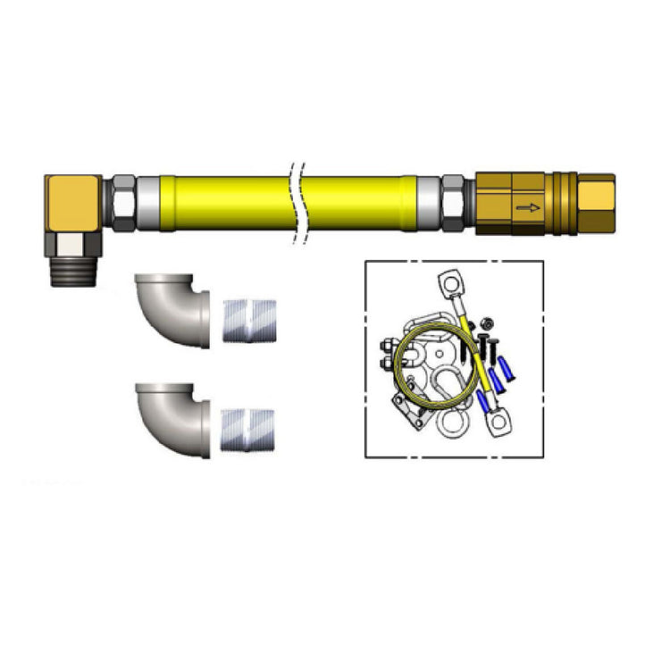 The T&S Brass HG-4E-48SEL-FF Safe-T-Link Gas Connector Hose is engineered to meet the rigorous demands of professional kitchen environments. Featuring a 1-inch connection and an extended 48-inch hose, this product is tailored for flexibility and ease of use. The stainless steel braiding, coupled with an extruded coating, ensures both durability and safety, making it an ideal choice for establishments prioritizing long-term reliability. Equipped with a Quick-Disconnect Swivelink fitting, this gas connector hose facilitates seamless installation and maintenance. It includes two 1-inch elbows and a robust 5-foot restraining cable kit, which enhances operational safety by preventing hose movement. With a minimum flow capacity of 335,000 BTU per hour, it caters effectively to high-demand cooking equipment. This gas connector hose is an essential component for commercial kitchens, ensuring a secure and efficient gas supply for appliances. Its design not only maximizes safety and functionality but also supports diverse culinary operations with its high flow capacity and adaptable fittings. The T&S Brass HG-4E-48SEL-FF is a reliable solution for any food service industry professional seeking to enhance their kitchen's gas connectivity infrastructure.