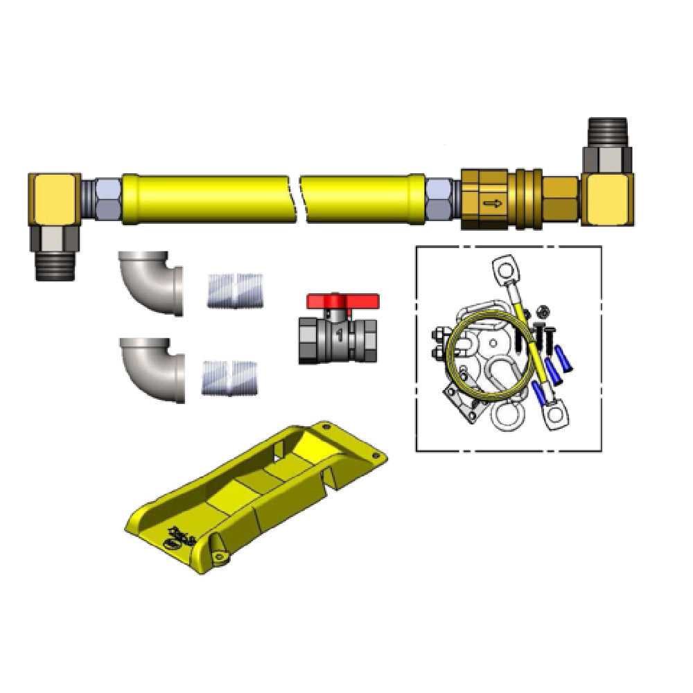 The T&S Brass HG-4E-48SK-FFPS Safe-T-Link Gas Connector Hose is engineered for optimal safety and efficiency in commercial gas applications, featuring a 1-inch connection and a 48-inch hose length. This product is meticulously crafted with stainless steel braiding and an extruded coating to bolster durability and withstand rigorous use. It integrates a Quick-Disconnect system that facilitates seamless installation and maintenance, enhancing operational simplicity. The inclusion of two Swivelink fittings and two 1-inch elbows provides flexibility and adaptability in various setups, making it suitable for diverse market segments ranging from restaurants to industrial kitchens. With a robust flow capacity of 335,000 BTU per hour, this gas connector hose ensures reliable performance under high-demand conditions. A ball valve is incorporated for precise control, while the two posi-set locating devices offer secure positioning. For added safety, the package includes a 5-foot restraining cable kit, delivering peace of mind in high-traffic environments. The T&S Brass HG-4E-48SK-FFPS Safe-T-Link Gas Connector Hose is an exemplary choice for professionals seeking a resilient and versatile solution in the gas connection domain, embodying a blend of innovation and reliability tailored to meet the dynamic needs of the food service industry.