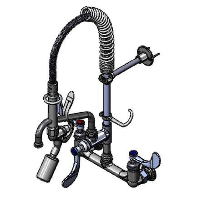 The T&S Brass MPW-8WWN-08-CR Mini Pre-Rinse Unit is an industrial-grade fixture designed for efficiency and durability in professional kitchens. Featuring an 8-inch wall mount configuration, it is tailored for spaces where compact but effective solutions are essential. The unit incorporates a spray valve with an 8-inch swing nozzle, allowing for versatile cleaning capabilities, suitable for varying kitchen demands. The ceramas technology ensures long-lasting performance, ideal for high-traffic environments. Wrist handles provide ergonomic operation, reducing strain during prolonged use. Additionally, a wall bracket is included, ensuring secure installation and stability during operation. This pre-rinse unit is engineered for those in the foodservice industry who require reliable and efficient pre-rinse solutions, making it a valuable asset in commercial kitchen setups.