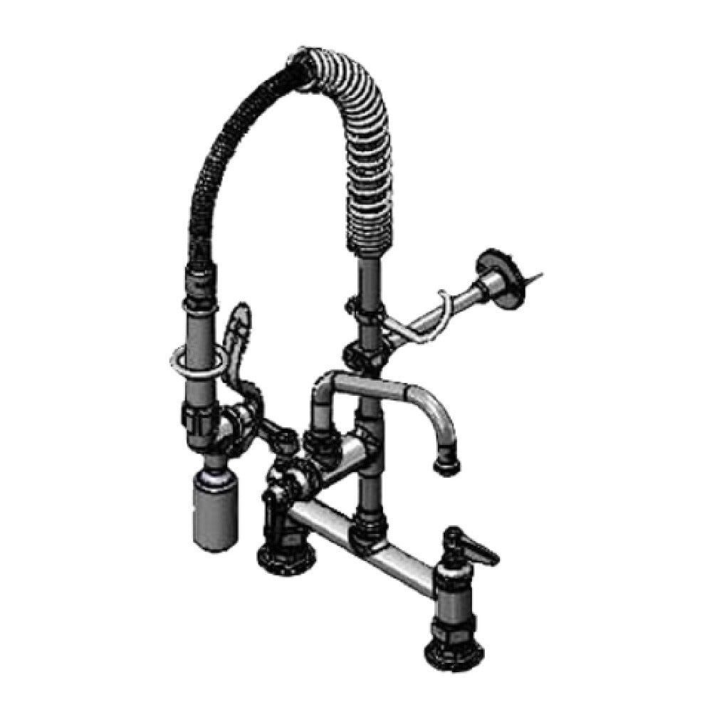 The T&S Brass MPY-8DLN-06 Mini Pre-Rinse Unit is a compact and efficient solution tailored for rigorous commercial kitchen environments. Featuring a low flow spray valve, this unit is engineered to conserve water while maintaining high performance, making it an eco-friendly choice for businesses aiming to reduce their environmental footprint. The 6-inch swing nozzle is designed to provide versatile water coverage, facilitating thorough cleaning without excessive water use. With lever handles, users can effortlessly control water flow and temperature, enhancing operational efficiency. The inclusion of a wall bracket ensures stable installation and space optimization, crucial for kitchens with limited room. This mini pre-rinse unit is ideal for various market segments, including restaurants, cafes, and catering businesses, providing a reliable and durable cleaning solution. The T&S Brass MPY-8DLN-06 stands out in the industry for its commitment to sustainability, efficiency, and functionality, meeting the demands of professional kitchens requiring robust and efficient pre-rinse units.
