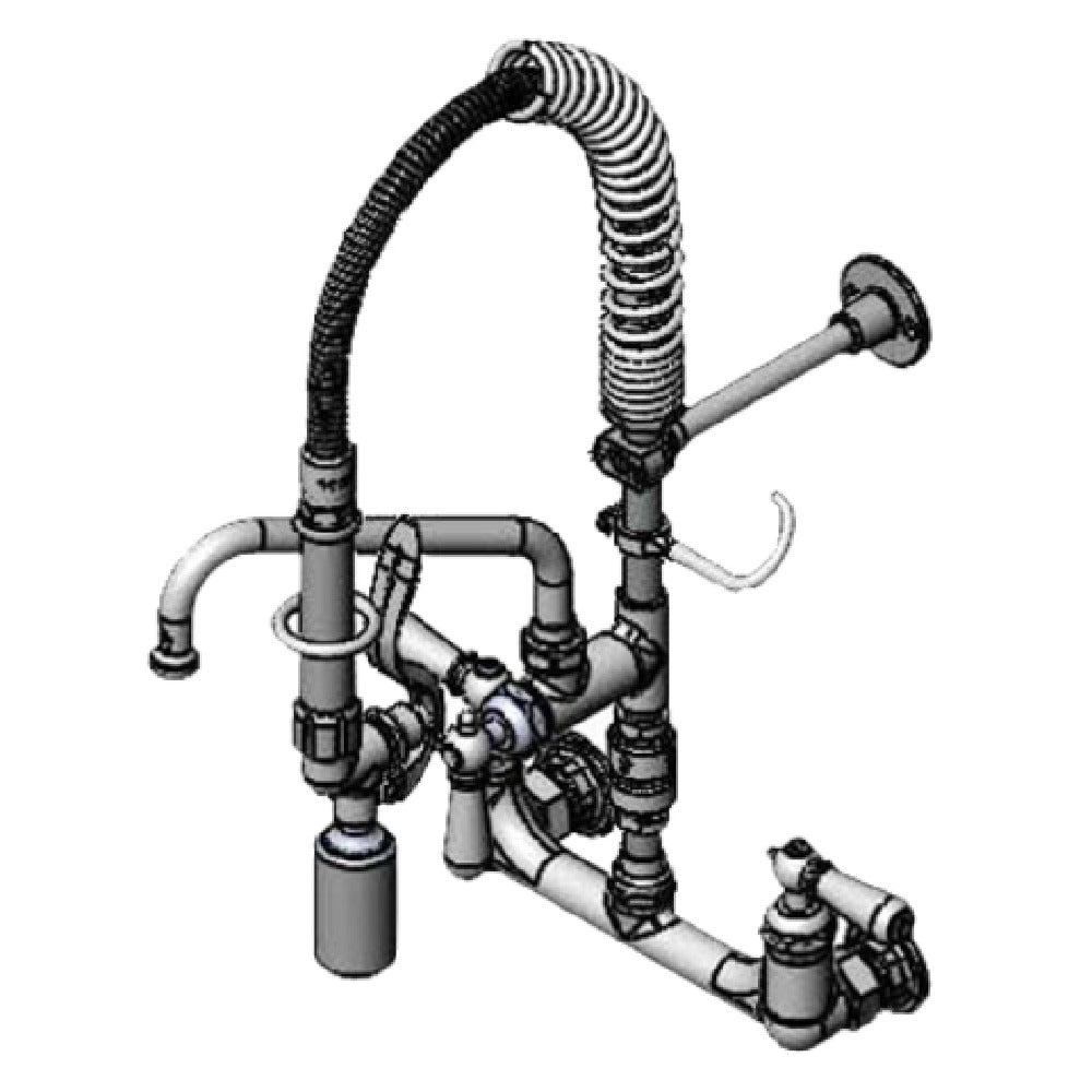 The T&S Brass MPY-8WCV-08-CR Mini Pre-Rinse Unit is a compact and efficient solution tailored for foodservice operations requiring versatile cleaning tools. This unit features a low flow spray valve that provides effective water conservation without sacrificing performance, making it ideal for establishments focused on sustainable practices. The 8-inch swing nozzle enhances reach and maneuverability, allowing effortless rinsing across a variety of sink configurations. Equipped with a vacuum breaker, this pre-rinse unit ensures prevention of backflow, securing water quality and safety during operation. The ceramas cartridge incorporated within the unit enhances durability and reliability, reducing maintenance needs and extending the product's lifespan. This combination of features makes the T&S Brass MPY-8WCV-08-CR an asset for diverse market segments, including restaurants, cafes, and institutional kitchens, where space efficiency and resource conservation are critical. Its specialized design supports rigorous daily use, aligning with the demands of high-volume kitchen environments. This unit represents a blend of practicality and innovation, designed to enhance workflow efficiency while adhering to environmental standards. Its thoughtful construction positions it as a valuable tool for professionals seeking to optimize their kitchen operations with reliable, high-performing equipment.