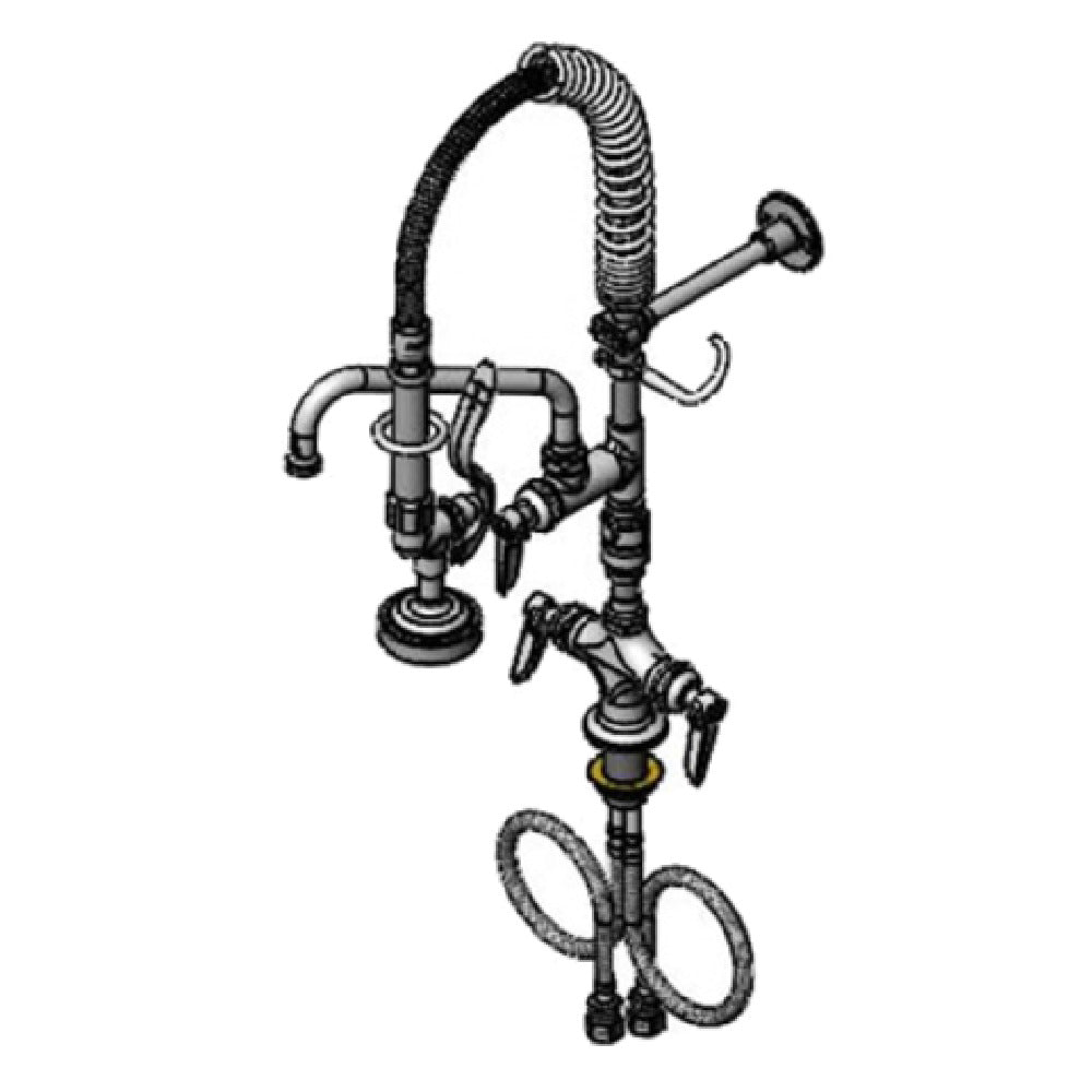 The T&S Brass MPZ-2DLV-08-CR Mini Pre-Rinse Unit is an innovative solution designed to meet the needs of various commercial kitchen environments. This unit is distinguished by its low flow spray valve, which is engineered to conserve water while maintaining high efficiency, making it an environmentally conscious choice for establishments emphasizing sustainability. The 8" swing nozzle provides flexibility and ease of use, allowing for efficient cleaning and rinsing tasks. Enhanced by a vacuum breaker, this unit ensures backflow prevention, complying with essential safety standards. The incorporation of ceramas enhances the durability and longevity of the device, making it a robust option for high-demand settings. The lever handles are designed for user-friendly operation, facilitating ease of use and contributing to a seamless workflow in busy kitchen spaces. The T&S Brass MPZ-2DLV-08-CR Mini Pre-Rinse Unit is particularly suited for restaurants, cafes, and catering services that require reliable and efficient pre-rinse capabilities. By combining practical features with a focus on water conservation, this unit stands out as a valuable asset in the food service industry, offering a blend of performance and sustainability in a compact design.