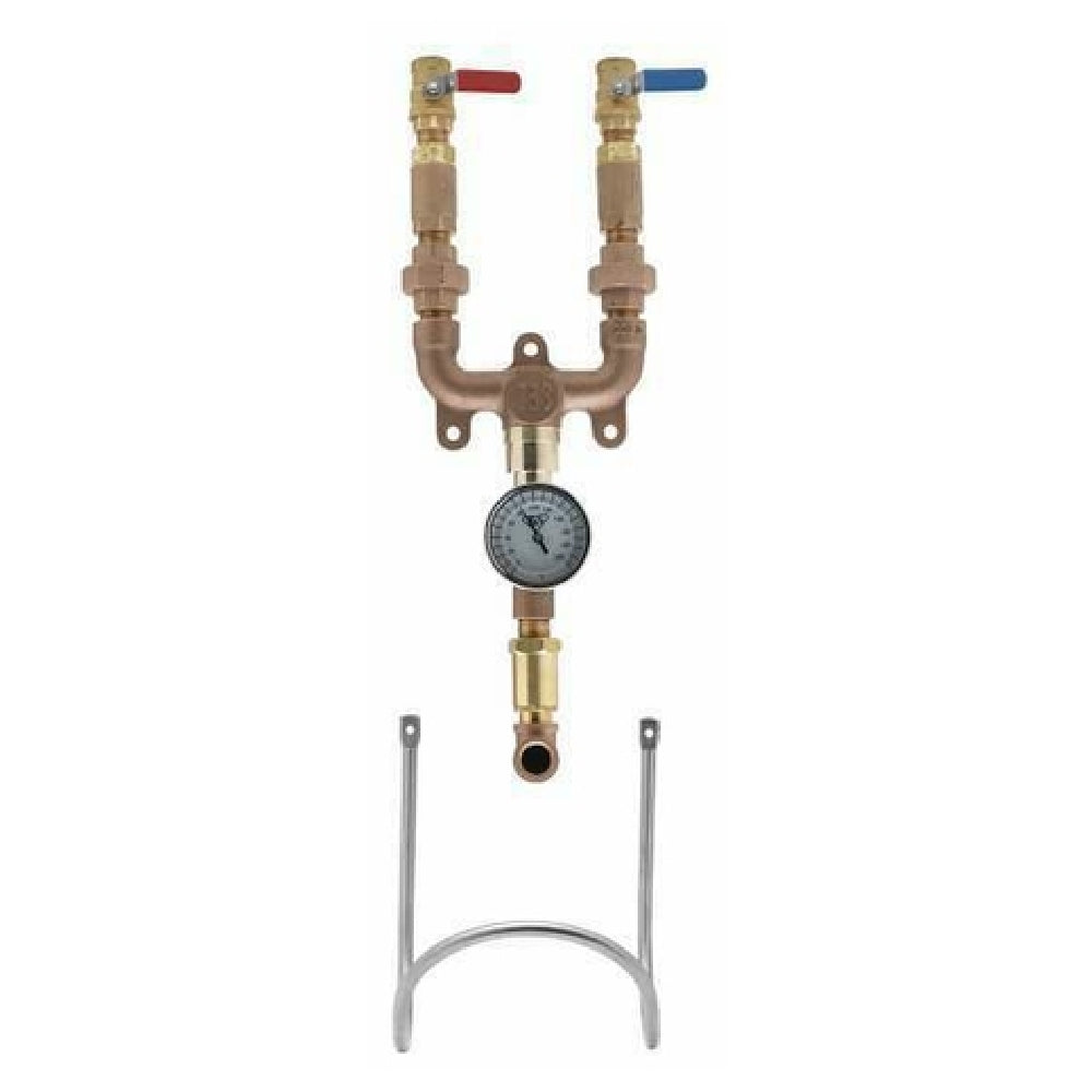 The T&S Brass MV-0771-12N-BVT Mixing Valve Assembly is a highly specialized unit featuring 3/4" globe valves accompanied by color-coded handles for intuitive operation. This assembly is designed for precision and reliability, incorporating 3/4" check valves and a 3/4" hose swivel, ensuring versatility and secure connections in various industrial applications. The inclusion of a stainless steel thermometer provides accurate temperature readings, which is crucial for operations requiring stringent temperature control. Additionally, the brass tee enhances the durability and longevity of the assembly, making it a reliable choice for heavy-duty usage. A hose rack is integrated into the design for organized storage and easy access. This mixing valve assembly caters to a diverse range of industry segments, from plumbing to manufacturing, where precise fluid control and high-quality materials are paramount. Its robust construction and thoughtful design make it an essential component for professionals seeking efficiency and dependability in their fluid management systems.