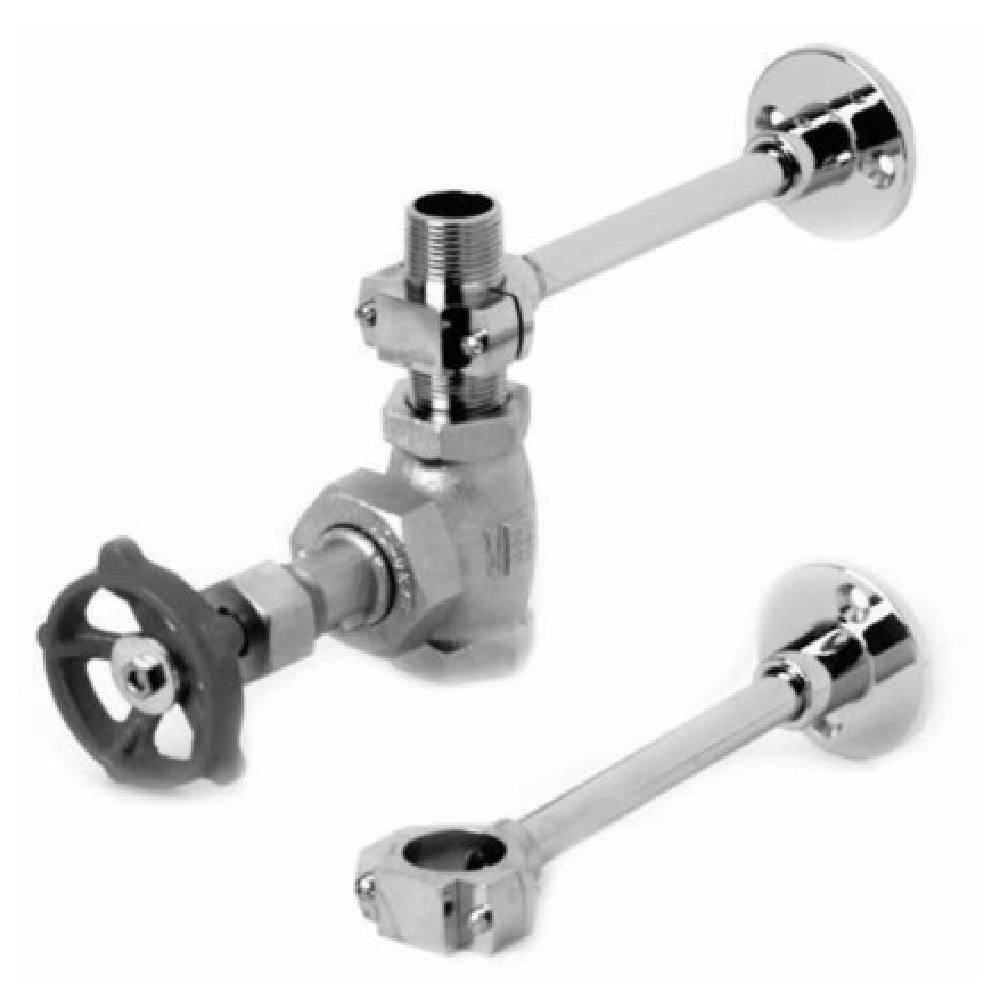 The T&S Brass MV-1907-12C Mixing Valve Assembly is a precision-engineered solution designed for high-performance plumbing applications. This assembly features two wall brackets, ensuring secure and stable installation, which is critical for maintaining the integrity of plumbing systems. It is equipped with a 3/4" check valve that prevents backflow, ensuring the consistent quality and safety of water supply. The 3/4" globe valve allows for precise control over water flow, making it ideal for environments where exact water pressure regulation is essential. The assembly includes a 3/4" nipple and is configured with a 3/4" NPT connection, facilitating easy integration with existing plumbing setups. Constructed from chrome-plated brass, the MV-1907-12C not only offers a sleek, professional appearance but also ensures durability and resistance to corrosion, extending the product's lifespan under frequent use. This mixing valve assembly is particularly suited for commercial and industrial segments where reliable, high-quality plumbing components are a necessity, providing a robust solution that meets rigorous operational demands.