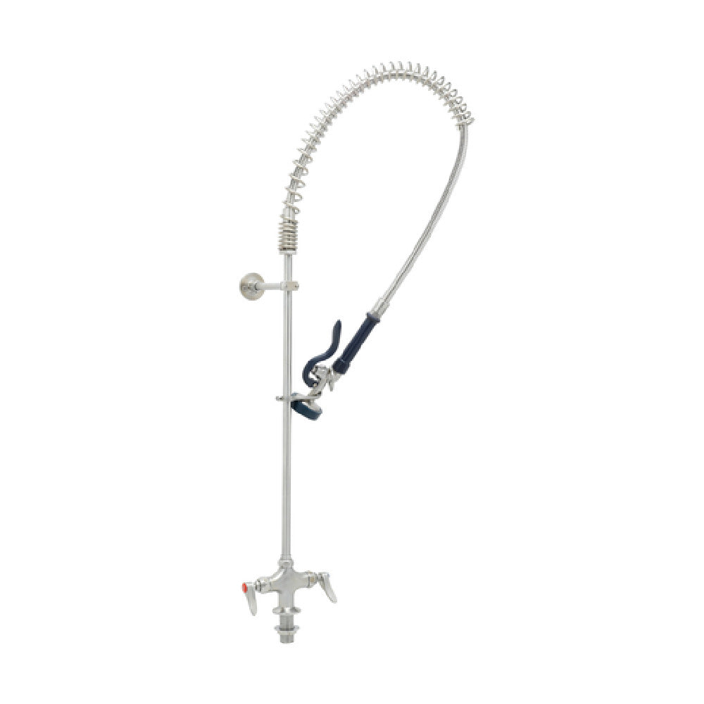 The T&S Brass S-0113-B EverSteel Pre-Rinse Unit - EasyInstall Stainless Steel Single Hole Deck Mount Mixing Faucet is a robust and efficient solution for commercial kitchens requiring high durability and performance. Engineered with stainless steel quarter-turn Eterna cartridges equipped with spring checks, this unit ensures reliable water flow control and longevity. The faucet features stainless steel lever handles and a 44-inch flexible stainless steel hose, providing ease of use and adaptability to various pre-rinse tasks. The stainless steel 1.15 GPM spray valve effectively balances water efficiency and cleaning power. Additionally, a 6-inch wall bracket and flexible stainless steel supply hoses enhance the unit’s stability and installation flexibility. Certified to ASME A112.18.1/CSA B125.1, NSF 61-Section 9, and NSF 372 standards, the S-0113-B EverSteel Pre-Rinse Unit is compliant with 2019 DOE PRSV Class II requirements, ensuring it meets rigorous safety and performance criteria. This product is ideal for different market segments within the food service industry, delivering exceptional quality and reliability for settings ranging from small cafes to large-scale restaurant operations. Its thoughtful design and stainless steel construction make it an invaluable asset for any kitchen requiring a dependable pre-rinse solution.
