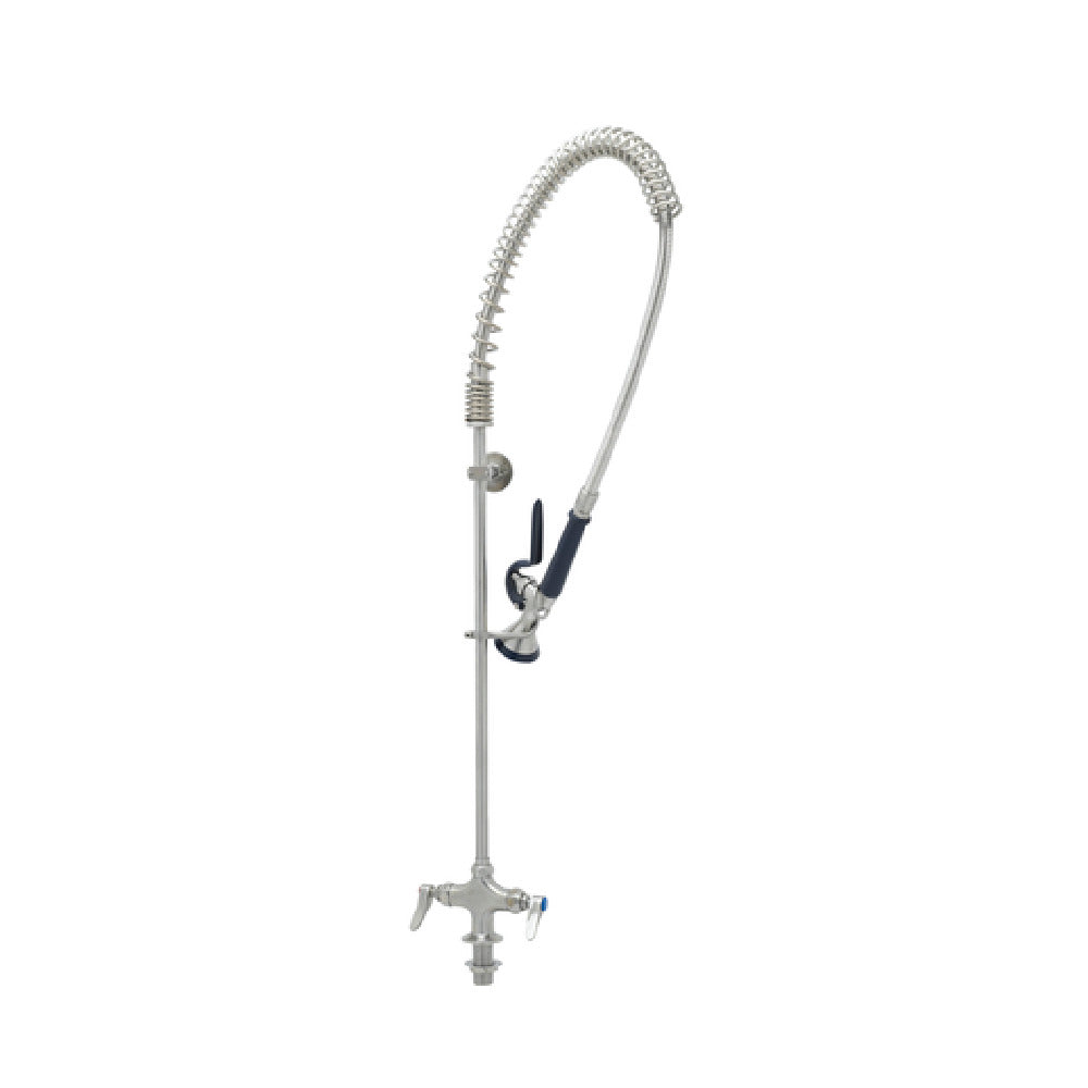 The T&S Brass S-0113-BY EverSteel Pre-Rinse Unit is a single hole stainless steel deck mount mixing faucet designed for efficient kitchen operations. This unit features a sturdy 24-inch riser and a 44-inch flexible stainless steel hose with a heat-resistant handle, ensuring durability and ease of use. It includes a 1.15 GPM stainless steel spray valve, model S-0107-Y, providing efficient water flow control. The faucet is equipped with stainless steel compression cartridges with spring checks and lever handles, enhancing its longevity and performance. Additionally, it comes with 18-inch flexible stainless steel supply hoses with G1/2-inch female swivel connections, making installation straightforward. The pre-rinse unit also includes a 6-inch adjustable stainless steel wall bracket, a spray valve holder, and an overhead spring for added functionality. This product is certified to ASME A112.18.1/CSA B125.1, NSF 61-Section 9, and NSF 372 standards, ensuring compliance with health and safety regulations. Furthermore, it meets the 2019 DOE PRSV Class II compliance requirements, making it suitable for various commercial kitchen environments. The T&S Brass S-0113-BY EverSteel Pre-Rinse Unit is an ideal choice for restaurants and food service operations looking for reliable and efficient pre-rinse solutions.
