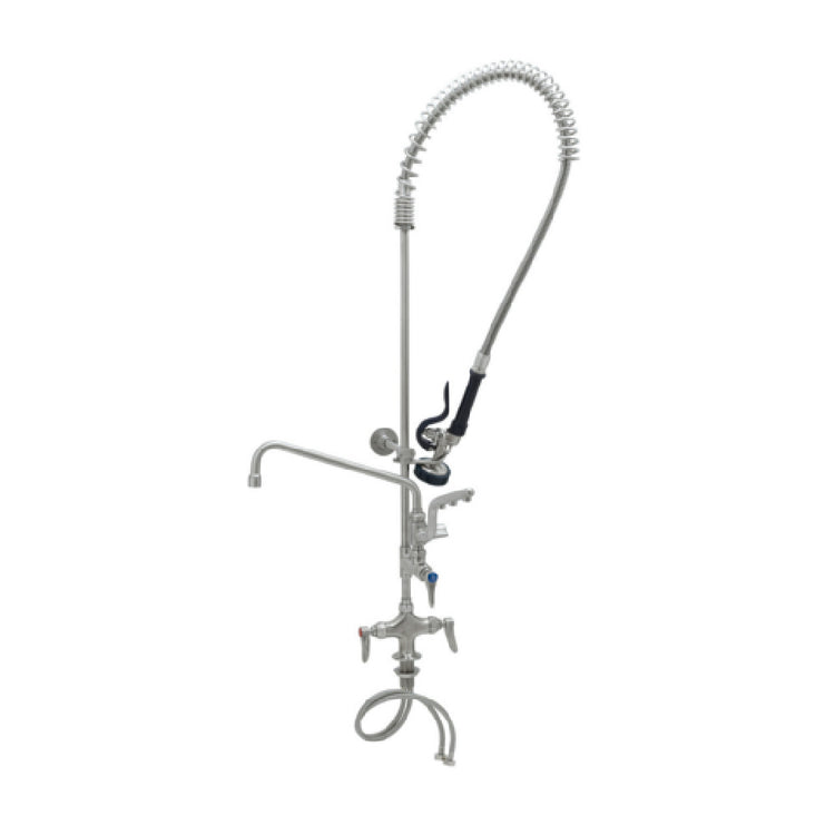 T&S Brass, S-0113-U12-B, Single hole deck mount mixing faucet, add-on faucet, 12” swing nozzle with stream regulator outlet, 24” riser, 44” flexible hose with heat resistant handle, 1.15 GPM spray valve, 1.5 GPM 10 7/16" multiple tip swivel spray arm, compression cartridges with spring checks, lever handles, 18” flexible supply hoses with G1/2 female swivel connections, 6” adjustable wall bracket, spray valve holder, and overhead spring, stainless steel construction, Certified to ASME A112.18.1/CSA B125.1, NSF 61-Section 9 and NSF 372. 2019 DOE PRSV - Class II compliant.