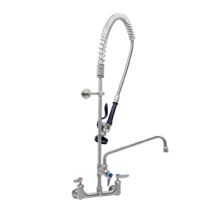 T&S Brass, S-0133-12-CR-B, EverSteel 8” wall mount mixing faucet with body, add-on faucet, 12” swing nozzle with stream regulator outlet, 18” riser, 44” flexible hose with heat resistant handle, 1.15 GPM blue spray valve, ceramic cartridges with check valves, lever handles, 1/2" NPT female inlets, 6” adjustable wall bracket, spray valve holder and overhead spring, stainless steel construction, Certified to ASME A112.18.1/CSA B125.1, NSF 61-Section 9 & NSF 372. 2019 DOE PRSV - Class II compliant.