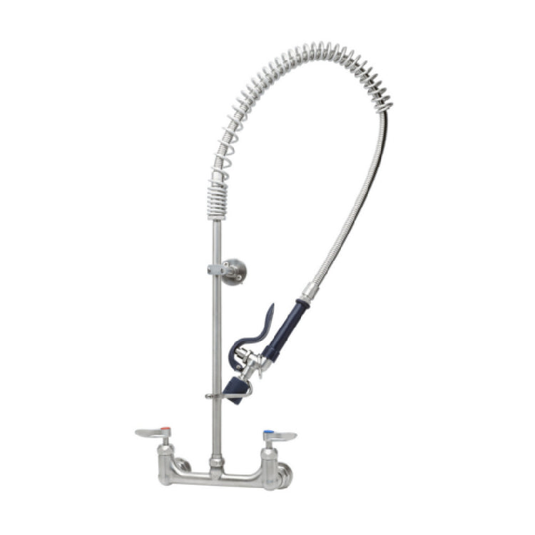 T&S Brass, S-0133-CR-BJ, EverSteel 8” wall mount mixing faucet with body, 18” riser, 44” flexible hose with heat resistant handle, 1.07 GPM blue spray valve, ceramic cartridges with check valves, lever handles, 1/2" NPT female inlets, 6” adjustable wall bracket, spray valve holder and overhead spring, stainless steel construction, Certified to ASME A112.18.1/CSA B125.1, NSF 61-Section 9 & NSF 372. 2019 DOE PRSV - Class II compliant.