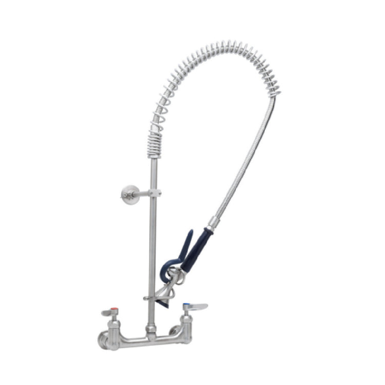 T&S Brass, S-0133-CR-BY, EverSteel 8” wall mount mixing faucet with body, 18” riser, 44” flexible hose with heat resistant handle, 1.15 GPM blue new style spray valve, ceramic cartridges with check valves, lever handles, 1/2" NPT female inlets, 6” adjustable wall bracket, spray valve holder and overhead spring, stainless steel construction, Certified to ASME A112.18.1/CSA B125.1, NSF 61-Section 9 & NSF 372. 2019 DOE PRSV - Class II compliant.