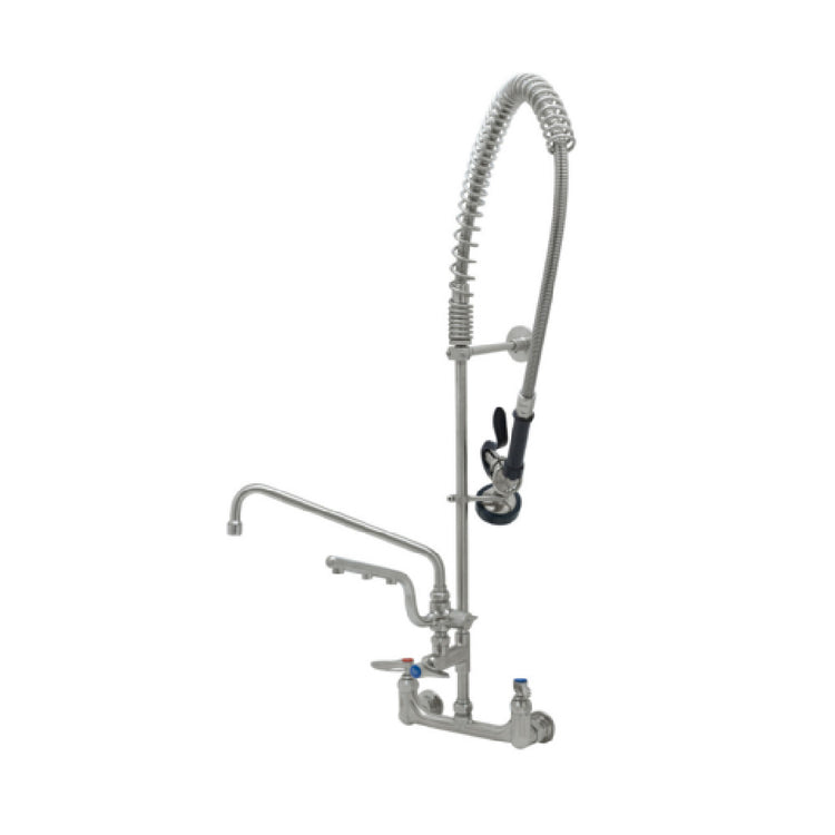 T&S Brass, S-0133-U12-B, EverSteel 8” wall mount mixing faucet with body, add-on faucet, 12” swing nozzle with stream regulator outlet, 1.5 GPM 10 7/16" multiple tip spray arm, 18” riser, 44” flexible hose with heat resistant handle, 1.15 GPM blue spray valve, compression cartridges with spring checks, lever handles, 1/2" NPT female inlets, 6” adjustable wall bracket, spray valve holder and overhead spring, stainless steel construction, Certified to ASME A112.18.1/CSA B125.1, NSF 61-Section 9 & NSF 372. 2019 DOE PRSV - Class II compliant.