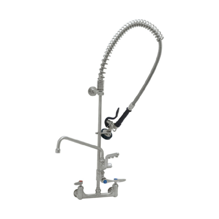 T&S Brass, S-0133-U12-CR-B, EverSteel 8” wall mount mixing faucet with body, add-on faucet, 12” swing nozzle with stream regulator outlet, 18” riser, 44” flexible hose with heat resistant handle, 1.5 GPM 10 7/16" multiple tip swivel spray arm, 1.15 GPM blue spray valve, ceramic cartridges with check valves, lever handles, 1/2" NPT female inlets, 6” adjustable wall bracket, spray valve holder and overhead spring, stainless steel construction, Certified to ASME A112.18.1/CSA B125.1, NSF 61-Section 9 & NSF 372. 2019 DOE PRSV - Class II compliant.