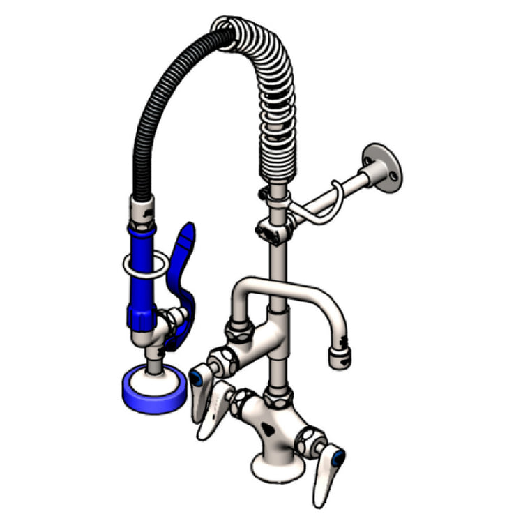 T&S Brass, SMPK-2DLN-06-CR, Mini Pre-Rinse Unit, single hole deck mount mixing faucet, add-on faucet, 6” swing nozzle with stream regulator outlet, 8” riser, 24” flexible hose with heat resistant handle, 1.15 GPM spray valve, ceramic cartridges with check valves, lever handles, 18” flexible supply hoses with G1/2” female swivel connections, 6” adjustable wall bracket, spray valve holder, and overhead spring, stainless steel construction, Certified to ASME A112.18.1/CSA B125.1, NSF 61-Section 9 and NSF 372. 2019 DOE PRSV - Class II Compliant.