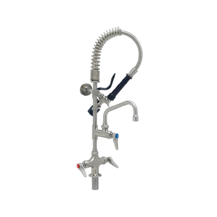 The T&S Brass SMPM-2DLN-06 EverSteel Pre-Rinse Unit is a single-hole, stainless steel deck mount mixing faucet designed for rigorous commercial environments. This unit features a stainless steel add-on faucet and a 6-inch swing nozzle equipped with a stream regulator outlet, perfect for precise water flow control. An 8-inch riser supports the 24-inch flexible stainless steel hose, which includes a heat-resistant handle for user safety. The stainless steel 1.07 GPM spray valve ensures efficient water usage, while the durable compression cartridges with spring checks enhance performance and reliability. Designed for versatile installation, it comes with 18-inch flexible stainless steel supply hoses and G1/2-inch female swivel connections, complemented by a 6-inch adjustable wall bracket for secure mounting. Additionally, the unit includes a stainless steel spray valve holder and an overhead spring, enhancing its functionality and user convenience. Certified to ASME A112.18.1/CSA B125.1, NSF 61-Section 9, and NSF 372 standards, this pre-rinse unit meets stringent safety and performance requirements, making it a valuable asset for the food service industry. Its compliance with 2019 DOE PRSV - Class II standards further underscores its efficiency and suitability for diverse market segments within commercial kitchen operations.