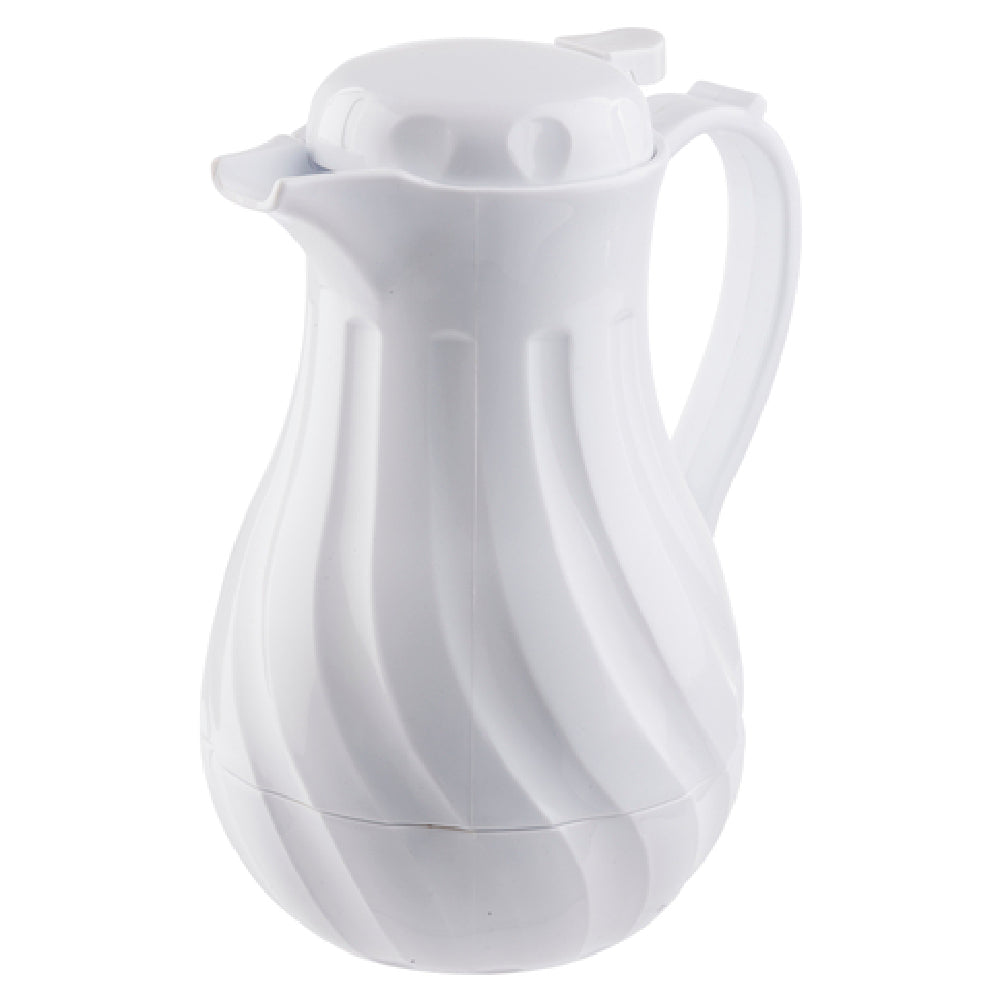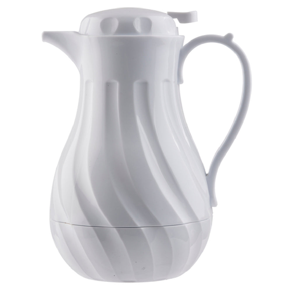 The Tablecraft 1001302 Cash & Carry Connoisserve™ Coffee Decanter 20 Oz. stands out as a versatile and efficient solution for coffee service across various industry segments. This decanter boasts a capacity of 20 ounces, making it suitable for small to medium-sized gatherings or personal use. It features a unique thumb press mechanism, providing ease of use and precision in pouring. The swirl design not only adds an aesthetic appeal but also enhances grip and handling. One of its most notable technical attributes is the triple wall insulation, which ensures that beverages remain at the desired temperature for extended periods, catering to both hot and cold coffee preferences. This product comes with a color tag set, allowing for easy identification and customization, which is particularly advantageous in settings requiring color coding or personalization. The decanter is made of durable plastic and comes in a sleek white color, offering a modern yet classic look. Although it is hand wash only, this ensures that the structural integrity and aesthetic appeal are maintained over time. Each unit is individually boxed, making it an ideal choice for retail environments or individual purchase options. The Tablecraft 1001302 Cash & Carry Connoisserve™ Coffee Decanter combines functionality and style, making it a valuable addition to any coffee service operation.