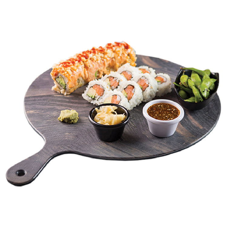 The Tablecraft 10016 Serving Paddle is a versatile kitchen utensil that combines functionality with a rustic aesthetic, making it suitable for a range of culinary uses. Featuring a 12-1/2 inch diameter, it provides ample surface area for serving a variety of dishes, from artisanal pizzas to cheese and charcuterie spreads. The overall length, including the handle, is 16-1/2 inches, offering a comfortable grip for ease of handling and serving. Crafted from durable melamine, this serving paddle ensures a lightweight yet sturdy construction, ideal for both professional and home kitchens. The melamine material also presents a barnwood pattern, giving it a unique, rustic charm that enhances the presentation of food in casual dining settings or themed events. This serving paddle is designed to meet the needs of diverse market segments, including restaurants, catering services, and hospitality venues, by providing a reliable tool that balances functionality with an appealing design. The Tablecraft 10016 Serving Paddle stands out as a distinct addition to any food service operation, offering both style and practicality in one complete package.