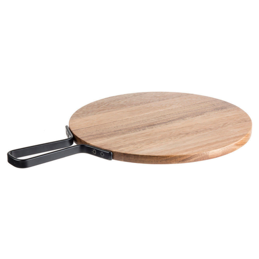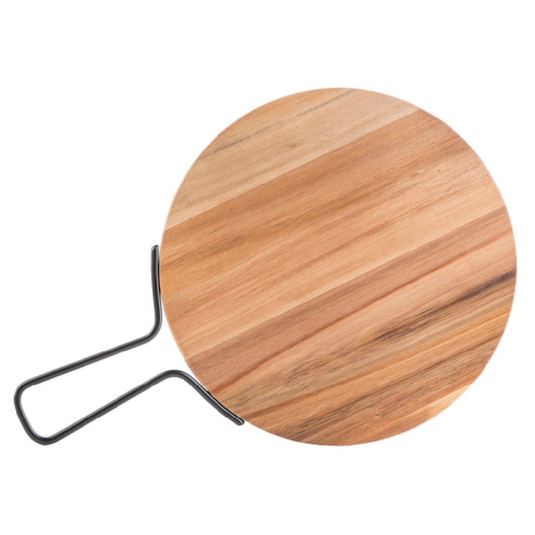 The Tablecraft 10080 Industrial Collection™ Serving Paddle is a meticulously crafted serving accessory, measuring 12 inches in diameter and 3/5 inches in height, with an overall length of 16-3/4 inches including the handle. This round serving paddle is made from durable acacia wood, known for its naturally occurring light brown hue, which adds an element of rustic charm to any serving situation. A distinctive feature of the serving paddle is its metal banding, which not only enhances its industrial aesthetic but also provides additional structural support, ensuring longevity in high-use environments. The design of the paddle makes it an ideal choice for various segment markets, including restaurants, catering services, and home entertainment settings, where both functionality and style are paramount. The handle allows for easy maneuverability and presentation, making it perfect for serving a variety of foods, from artisanal pizzas to charcuterie. This serving paddle seamlessly combines form and function, meeting the demands of professional food service environments while also appealing to home users seeking to elevate their dining experience. Its thoughtful design and quality materials underscore its value within the food service industry as a reliable and stylish serving tool.