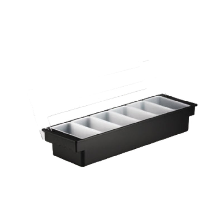 The Tablecraft 102 Bar Condiment Holder is a versatile and efficient solution designed for professional bar settings. Measuring 19-1/2 inches by 6 inches by 4-1/4 inches, this unit is compact yet accommodates an impressive range of condiments. It features six 1-pint white inserts, allowing for organized storage and quick access to garnishes, mixers, or other essential bar elements. The clear lid ensures visibility while protecting contents from contaminants, enhancing both hygiene and convenience. Crafted from durable ABS plastic, the holder is both lightweight and sturdy, making it a practical choice for high-traffic environments. Its sleek black finish complements various bar decors, adding an element of professional elegance. Furthermore, the Tablecraft 102 Bar Condiment Holder is dishwasher safe, facilitating effortless cleaning and maintenance, crucial for maintaining high standards of cleanliness in busy bar operations. This product's thoughtful design and functional features make it an excellent choice for bartenders, catering events, or any hospitality setting that prioritizes efficiency and organization in service. Whether for a bustling nightclub or a cozy pub, its strategic dimensions and practical design provide optimal utility and reliability.