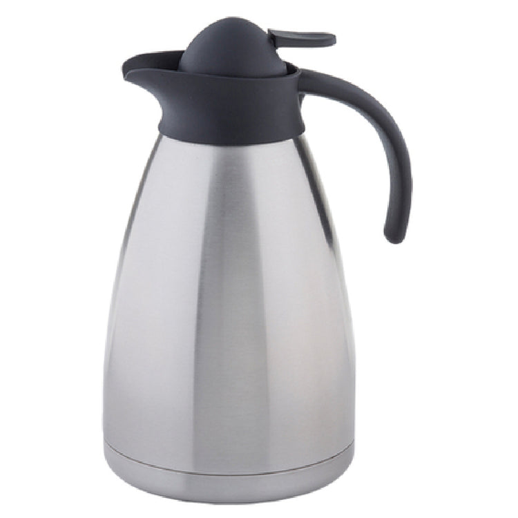 The Tablecraft 10297 Coffee Carafe - 34 Oz. Thumb Press Black Plastic Lid is a meticulously designed beverage service solution that caters to a diverse range of industry segments, including hospitality, catering, and office environments. This coffee carafe features a 34 oz. capacity, making it ideal for serving multiple guests or customers in busy settings. The innovative thumb press mechanism integrated into the black plastic lid allows for easy and controlled pouring, enhancing user convenience. Engineered with vacuum insulation, this carafe ensures optimal temperature retention, keeping beverages hot or cold for extended periods. Constructed with stainless steel, it boasts durability and a sleek appearance, aligning with professional service standards. Although dishwasher safe, hand washing is recommended to preserve its quality and lifespan. This carafe combines functionality and aesthetic appeal, making it a reliable choice for establishments prioritizing efficiency and style in their beverage service equipment. Its practical design and robust construction make the Tablecraft 10297 a valuable asset in any setting that demands high-quality beverage presentation and service.