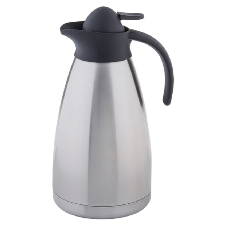 The Tablecraft 10299 Coffee Carafe - 68 Oz. Thumb Press Black Plastic Lid is a premium choice for both professional and home settings that require efficient beverage service. This carafe boasts a substantial 68-ounce capacity, making it an ideal solution for serving multiple guests in commercial environments such as restaurants, cafes, and conference facilities, as well as at large family gatherings or parties. The thumb press black plastic lid design ensures easy, spill-free dispensing, enhancing the user experience and minimizing waste. Constructed from durable stainless steel, this coffee carafe features vacuum insulation that maintains the optimal temperature of beverages for extended periods, catering to the needs of establishments with high turnover or those requiring extended service times. Although it is dishwasher safe for convenient cleaning, a hand wash is recommended to preserve the quality and longevity of the product. This thoughtful design and robust construction make it a reliable tool for any setting that values efficiency and quality in beverage service, while providing a sleek and professional appearance that complements any decor. The Tablecraft 10299 Coffee Carafe represents a blend of practicality and style, making it a versatile asset in various market segments within the food and beverage industry.