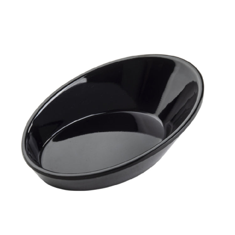 The Tablecraft 10313BK Mini Dish is a compact serving solution designed for versatility across various culinary environments. Measuring 3-1/2 inches by 2-3/8 inches by 1-1/8 inches, this dish boasts a sleek oval shape that enhances the presentation of small portions, making it an ideal choice for appetizers, condiments, or tasting samples. With a capacity of 3/4 oz., it is perfectly suited for precise portion control. Crafted from durable melamine, the dish is both lightweight and resilient, offering a practical alternative to traditional ceramic or glass options. Its black color adds a touch of elegance, complementing a wide range of table settings. Notably, the Tablecraft 10313BK Mini Dish is dishwasher safe, ensuring convenient and efficient cleaning in fast-paced food service environments. This product is sold in multiples of 24, catering to the needs of larger establishments such as restaurants, hotels, and catering services, where consistent presentation and uniformity are key. The durability and aesthetic appeal of the Tablecraft 10313BK Mini Dish make it a valuable addition to any professional kitchen, providing both functionality and style in a compact form.