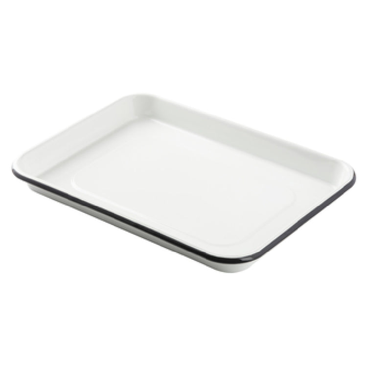 The Tablecraft 10347 Sheet Pan is meticulously designed to meet the diverse needs of culinary professionals, offering a unique blend of functionality and durability. This 1/4 size sheet pan measures 13" x 9-1/2" x 1-1/8", perfectly catering to smaller baking and roasting tasks. Crafted from enamel, the pan combines a white surface with a striking black rim, which not only enhances its aesthetic appeal but also adds an extra layer of protection, reducing the risk of chipping and wear. The enamel construction ensures even heat distribution, which is critical for achieving consistent cooking results, making it a reliable choice for bakers aiming for precision and efficiency. Ideal for use in both commercial and residential kitchens, the Tablecraft 10347 Sheet Pan supports a variety of cooking styles and techniques, catering to pastry chefs and home bakers alike who demand high performance from their kitchen tools. Its compact size is especially advantageous for operations with limited oven space, allowing for efficient multitasking and utilization of available resources. The distinctive blend of size, material, and design elements positions the Tablecraft 10347 as an indispensable asset in any culinary setting where quality and reliability are paramount.