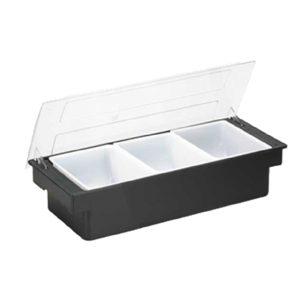 The Tablecraft 104 Bar Condiment Holder is a versatile and practical solution for establishments looking to organize their bar or serving station efficiently. Measuring 19-1/2 inches by 6 inches by 4-1/2 inches, it is compact yet spacious enough to accommodate various condiments. The holder comes with three 1-quart white inserts, allowing for easy access and replenishment of sauces, garnishes, and other bar essentials. A clear lid provides visibility while keeping contents fresh and protected from contaminants. Constructed from durable ABS plastic in a sleek black finish, this condiment holder not only ensures longevity but also adds a professional aesthetic to any setting. Its dishwasher-safe feature ensures hassle-free cleaning, making it a practical choice for busy environments such as bars, restaurants, or catering events. The Tablecraft 104's blend of functionality and design makes it a unique asset for businesses aiming to enhance service efficiency and maintain an organized workspace. Whether for a bustling bar or a catered event, this condiment holder meets the demanding needs of various industry segments with its thoughtful features and robust construction.
