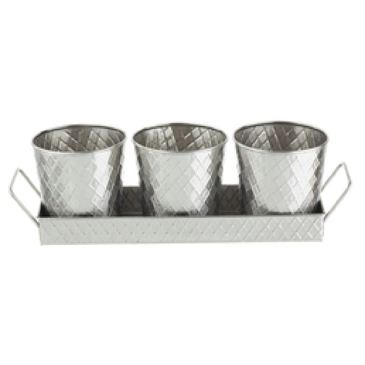 The Tablecraft 10486 Lattice Collection™ Snack Set is a meticulously crafted 4-piece ensemble designed to elevate your dining experience. Measuring 14-5/8 inches in length, 4-1/4 inches in width, and 4-1/4 inches in height, this rectangular snack set is the epitome of modern elegance and functionality. Constructed from premium stainless steel, it exudes durability and a sleek aesthetic that seamlessly complements any table setting. The set's unique lattice design offers a touch of sophistication, making it an ideal choice for upscale dining establishments or home gatherings. Its versatile size and design make it suitable for a variety of snacks, appealing to different segments of the market, from restaurants and cafes to hospitality settings. The Lattice Collection's combination of style, practicality, and quality materials presents a compelling value proposition for industry professionals seeking to enhance their service offerings with a touch of class and reliability. The Tablecraft 10486 seamlessly blends form and function, providing a durable and stylish solution for serving snacks in any culinary environment.
