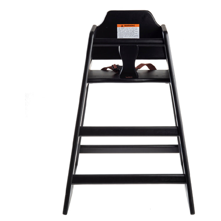 The Tablecraft 10624 High Chair is a meticulously engineered seating solution designed for diverse environments, measuring 23 inches wide, 20-1/8 inches deep, and 29-1/2 inches high. Crafted from high-quality wood and finished in a sleek black color, this high chair combines aesthetic appeal with functional durability. Its stackable design offers a practical space-saving benefit, making it ideal for bustling restaurants, cafes, and family-friendly dining establishments where storage efficiency is paramount. The chair is equipped with a 3-point ASTM-compliant strap, ensuring enhanced safety for young diners by providing reliable restraint during use. Notably, this product is delivered unassembled, allowing for convenient shipping and on-site assembly. The Tablecraft 10624 High Chair's compliance with ASTM standards underscores its commitment to safety and quality, making it a preferred choice for businesses prioritizing child-friendly amenities. This high chair seamlessly integrates into various dining settings, offering a versatile and dependable seating option that aligns with both safety regulations and practical storage needs.