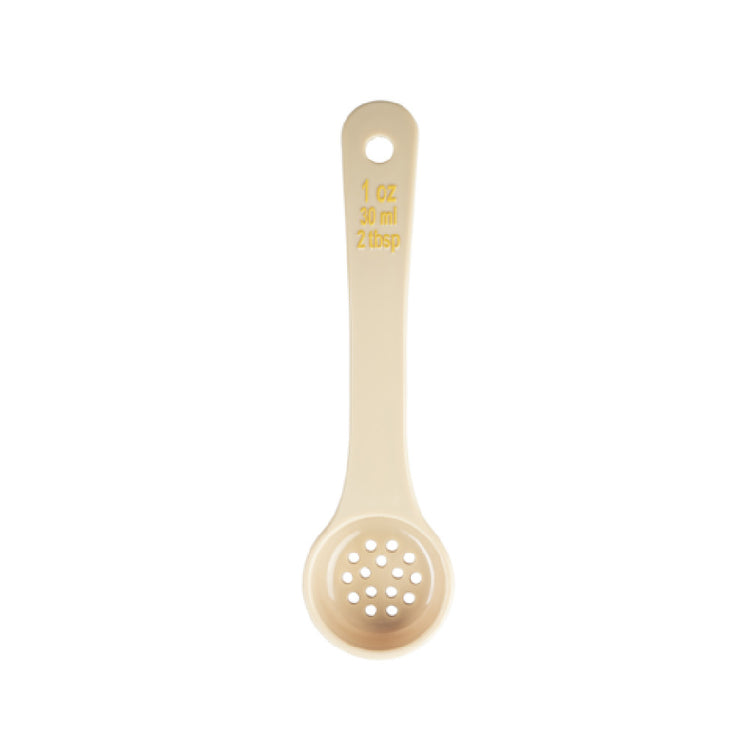 The Tablecraft 10639 Spoonout 1 Oz. 7.375" x 2" x .875" is a precision-engineered utensil designed for both efficiency and durability in various foodservice operations. This spoonout features a 1-ounce capacity, making it perfect for portion control in commercial kitchens. With dimensions of 7.375 inches in length, 2 inches in width, and 0.875 inches in height, it is compact yet functional, ideal for both small and large-scale culinary tasks. The perforated design allows for efficient draining, ensuring that only the desired amounts of liquid are retained, which is essential in scenarios requiring meticulous ingredient management. The short handle is marked with yellow capacity indicators in both ounces and milliliters, making it easy to measure with precision. Constructed from polycarbonate, this spoonout is both lightweight and highly durable, capable of withstanding frequent use in demanding kitchen environments. The beige color adds a subtle aesthetic touch that blends seamlessly with various kitchen decors. Additionally, it is NSF certified, highlighting its compliance with rigorous health and safety standards. This tool's design and functionality cater to the diverse needs of professionals in the foodservice industry, offering reliability and precision in every use.