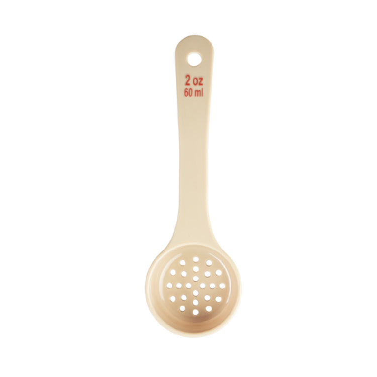 The Tablecraft 10643 Spoonout 2 Oz. 7.875" x 2.5" x 1" is an expertly crafted utensil, designed for precision and efficiency in various culinary environments. This spoonout features a compact size of 7.875 inches in length, 2.5 inches in width, and 1 inch in height, making it ideal for maneuverability in both commercial and home kitchens. It is constructed from durable polycarbonate, offering a lightweight yet sturdy tool that is built to withstand the rigors of daily use. The beige color adds a subtle elegance to its design, while the short handle includes red capacity markings in both ounces and milliliters, allowing for accurate portion control, essential in food preparation and service. Additionally, the spoonout is perforated, which is particularly beneficial for draining liquids, making it a versatile addition to any kitchen toolkit. Certified by NSF, the Tablecraft 10643 Spoonout meets the high standards required for public health protection, ensuring safety and reliability. Its specialized features cater to various market segments, including restaurants, catering services, and home cooks, offering a practical solution for precise serving and portioning needs in diverse culinary settings.