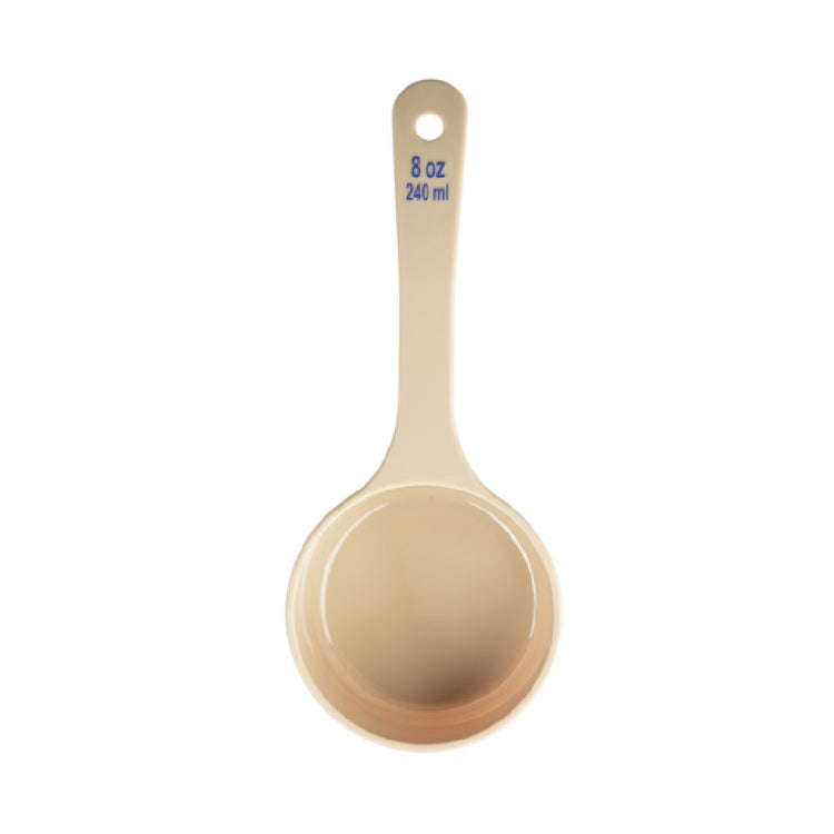 The Tablecraft 10658 Spoonout is a meticulously crafted kitchen tool designed for precision and efficiency in culinary tasks. With a capacity of 8 oz., this spoonout is ideal for measuring and serving various ingredients in both professional and home kitchens. Measuring 9.125" x 3.75" x 1.75", it boasts a compact and ergonomic design that facilitates ease of use and storage. The spoonout features a solid, short handle that enhances grip and control, making it particularly suitable for busy kitchen environments. The handle is equipped with blue capacity markings in both ounces and milliliters, allowing for quick and accurate measurements, which is a significant advantage for chefs and culinary enthusiasts who demand precision. Constructed from durable polycarbonate, the Tablecraft 10658 Spoonout is built to withstand the rigors of daily use while maintaining its integrity and functionality. Its beige hue adds a subtle aesthetic touch, seamlessly blending into diverse kitchen decors. NSF certification underscores its adherence to stringent health and safety standards, ensuring its suitability for use in professional food service settings. The Tablecraft 10658 Spoonout is a versatile and reliable tool that caters to the needs of various market segments, from commercial kitchens to catering services, emphasizing quality and precision.