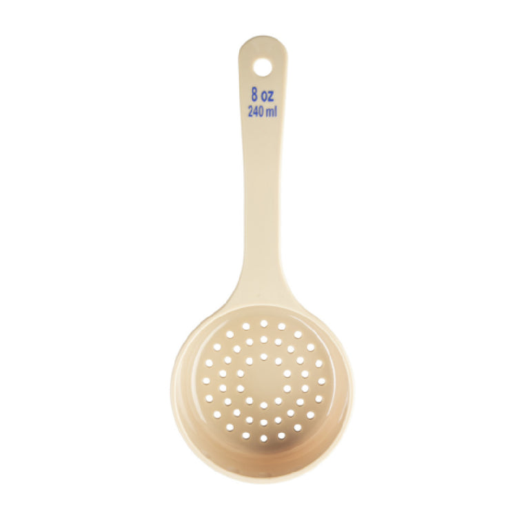 The Tablecraft 10659 Spoonout stands out in the culinary industry with its precise 8 oz. capacity, making it an essential tool for professional kitchens where accuracy is paramount. Measuring 9.125 inches by 3.75 inches by 1.75 inches, its compact size is perfectly suited for efficient ingredient portioning. This spoonout features a perforated design, ideal for straining liquids while serving, enhancing its utility in diverse food preparation tasks. The short handle is designed for ease of use, providing a comfortable grip for quick service in fast-paced environments. The blue capacity markings, presented in both ounces and milliliters, offer clear visibility and aid in precise measurement, crucial for maintaining consistency in recipes. Crafted from durable polycarbonate, this spoonout is not only robust but also lightweight and easy to handle, ensuring long-lasting performance in busy kitchens. The beige color adds a neutral, professional appearance that blends seamlessly with various kitchen aesthetics. NSF certification underscores its commitment to meeting strict public health and safety standards, making it suitable for commercial foodservice operations. The Tablecraft 10659 Spoonout is a versatile choice across different segment markets within the culinary industry, valued for its precision, durability, and compliance with safety standards.