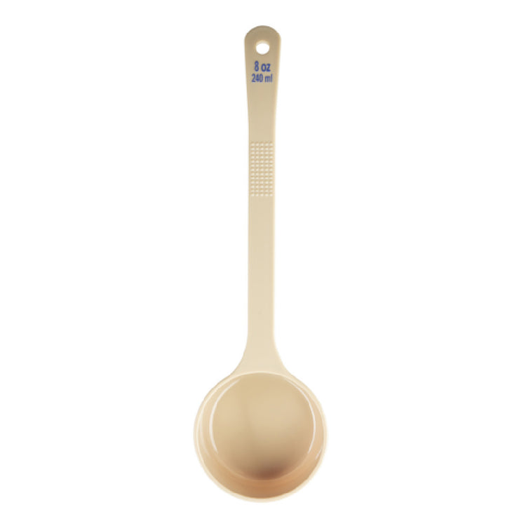 The Tablecraft 10660 Spoonout 8 Oz. is a versatile utensil designed for precision and convenience in various culinary settings. Measuring 13.375 inches in length, 3.75 inches in width, and 1.75 inches in height, this solid spoonout is crafted from durable polycarbonate, ensuring longevity and resilience in high-demand environments. Its beige finish is complemented by a long handle that features blue capacity markings in both ounces and milliliters, enhancing measurement accuracy for professional chefs and home cooks alike. This utensil is NSF certified, reflecting its adherence to the highest standards of public health and safety in food service. The ergonomic design of the Tablecraft 10660 makes it suitable for use in bustling restaurant kitchens, catering services, and even in home meal preparations where precise portioning is essential. Its robust construction and practical design make it a valuable tool across various segments of the food industry, from quick-service to fine dining establishments. The product's unique combination of functionality, durability, and compliance with safety standards distinguishes it as an indispensable asset in any culinary toolkit.