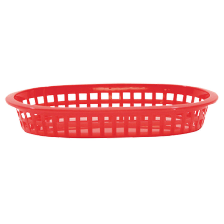 The Tablecraft 1073R A La Carte Platter Basket is a practical and versatile serving solution, measuring 9-1/4 inches by 6 inches by 1-1/2 inches, designed in an oval shape to accommodate various culinary presentations. Crafted from durable polypropylene, this platter basket is heat resistant up to 150°F (65°C), making it suitable for a range of food service environments. Its ability to withstand the demands of heat lamps, dishwashers, and microwaves adds to its convenience and adaptability, ensuring it meets the rigorous needs of fast-paced food service operations. The basket's vibrant red color not only adds a pop of color to any table setting but also signifies its robust construction. As it is made in the USA, it assures high-quality manufacturing standards. A unique aspect of this product is its purchasing requirement, which specifies that it must be bought in multiples of 36, making it an ideal choice for bulk buying by restaurants, catering services, and other hospitality businesses. This platter basket is a reliable and stylish accessory, perfect for enhancing the presentation of a la carte dishes while providing a practical and efficient solution for food service professionals.