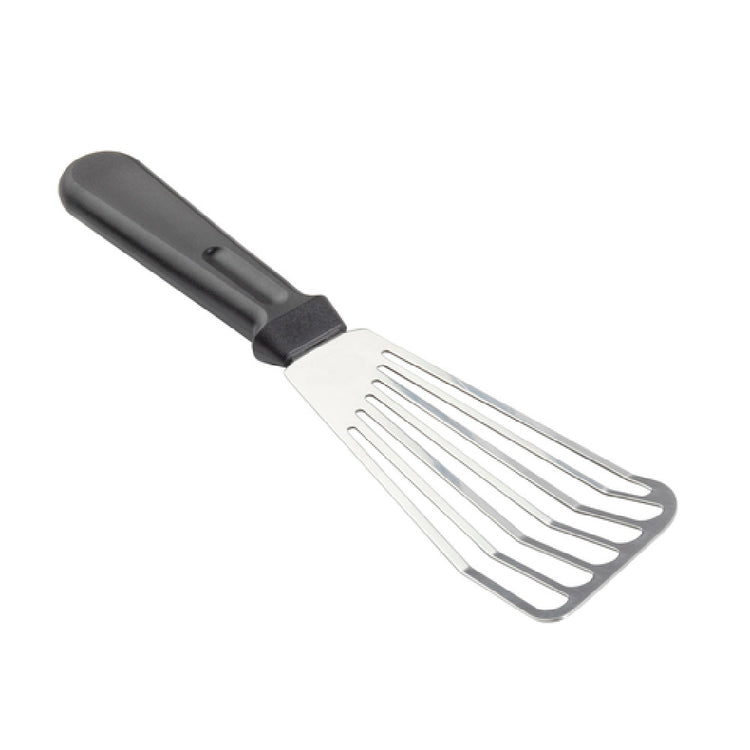 The Tablecraft 10942 Fish Turner is a precise kitchen tool measuring 6 inches by 2-7/8 inches by 5/8 inches, designed to meet the needs of both professional chefs and home cooking enthusiasts. Constructed from durable stainless steel, this fish turner is resistant to rust and corrosion, ensuring longevity and high performance in demanding kitchen environments. The addition of a black plastic handle not only provides a comfortable grip but also remains cool to the touch, enhancing safety during use. Its dishwasher-safe feature adds a layer of convenience, streamlining the cleaning process in busy culinary settings. The size and shape of the Tablecraft 10942 make it particularly suited for delicate tasks, such as flipping fish fillets or crepes, with precision and ease. This makes it an invaluable tool in seafood restaurants, catering services, or any culinary establishment where finesse and reliability are paramount. Its design reflects a commitment to quality and versatility, making it an essential addition to both commercial and domestic kitchens. The blend of functionality, durability, and ergonomic design positions the Tablecraft 10942 Fish Turner as a must-have for those seeking a balance of efficiency and practicality in their culinary tools.