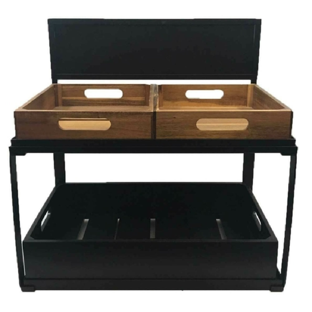 The Tablecraft 11000 Tiered Display is a versatile and meticulously designed product measuring 21-1/2" x 13-1/2" x 22-1/4", featuring a 2-tier rectangular structure that caters to the diverse needs of the food service industry. Its innovative design includes a removable chalkboard panel, providing a customizable and interactive element for users to display information effectively. This tiered display is engineered to accommodate various configuration needs, fitting (1) full, (2) half, (3) third, or (4) fourth-size crates, offering flexibility and adaptability for different presentation requirements. Constructed from high-quality powder-coated metal, the display is not only durable but also aesthetically pleasing with its sleek black finish. This product is ideal for environments ranging from bustling cafés and catering events to elegant buffet settings, allowing for an organized and efficient presentation of goods. Its thoughtful design and functionality make it a valuable asset for any establishment looking to enhance its presentation capabilities with a reliable and stylish display solution.