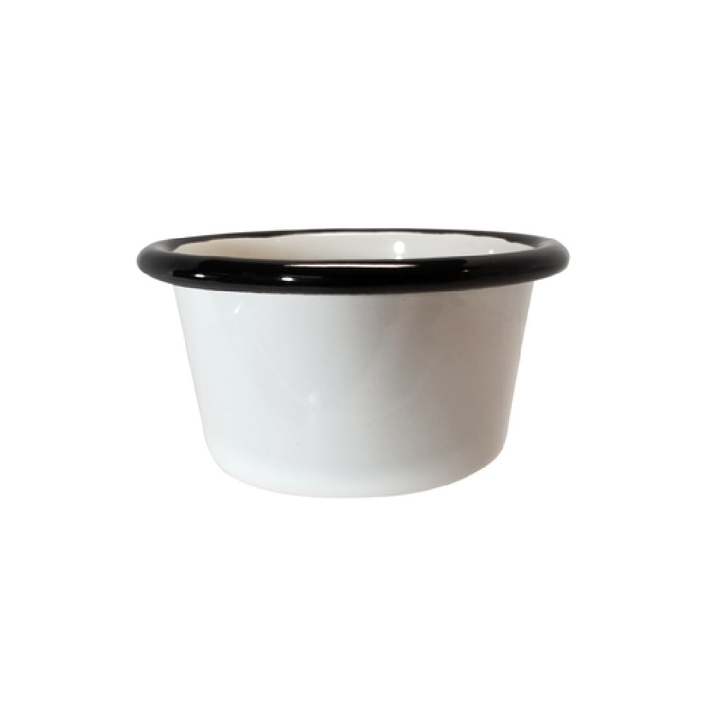 The Tablecraft 11048 Enamelware Collection™ Ramekin 5 Oz. Round is a meticulously crafted kitchen accessory, combining functionality with a timeless aesthetic. This ramekin, with a capacity of 5 ounces, stands out in the culinary world for its durable construction, made from vitreous porcelain enamel over steel. The combination of materials not only ensures the ramekin's robustness but also imbues it with a classic black and white color scheme that complements a variety of table settings. Its round shape is ideal for serving individual portions of condiments, desserts, or appetizers, making it a versatile addition to restaurants, cafes, and home kitchens. The enamel coating provides a non-porous surface, facilitating easy cleaning and stain resistance, which is particularly beneficial in high-traffic dining establishments. The sturdy steel core enhances its heat retention properties, ensuring dishes remain at the desired temperature for longer periods. The Tablecraft 11048 Enamelware Collection™ Ramekin is a valued choice for culinary professionals seeking reliability and style in their serving ware, offering a solution that is both practical and aesthetically pleasing across diverse market segments within the food service industry.