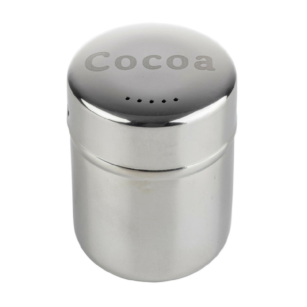 The Tablecraft 11051 Shaker - 6 Oz. "Cocoa" Imprint is an expertly crafted kitchen accessory designed for both professional and home use, particularly appealing to the food service industry. This shaker is constructed with durable stainless steel, ensuring long-lasting performance and a sleek, modern appearance. With a 6-ounce capacity, it is perfectly sized for controlled dispensing of cocoa powder, making it an essential tool for bakers, baristas, and culinary enthusiasts who specialize in creating desserts, beverages, and various gourmet dishes. The "Cocoa" imprint on the shaker provides a clear and stylish identification, adding a touch of elegance to any kitchen setting. Notably, this product is dishwasher safe, offering convenience and ease of maintenance, which is highly valued in fast-paced environments such as cafes and bakeries. The Tablecraft 11051 Shaker represents a blend of practicality and aesthetic appeal, catering to establishments that prioritize both function and design in their kitchen tools. Its high-quality materials and thoughtful design make it a reliable choice for those seeking efficiency and style in their culinary processes. Whether used in a bustling commercial kitchen or a cozy home setting, this shaker delivers consistent performance and enduring quality.