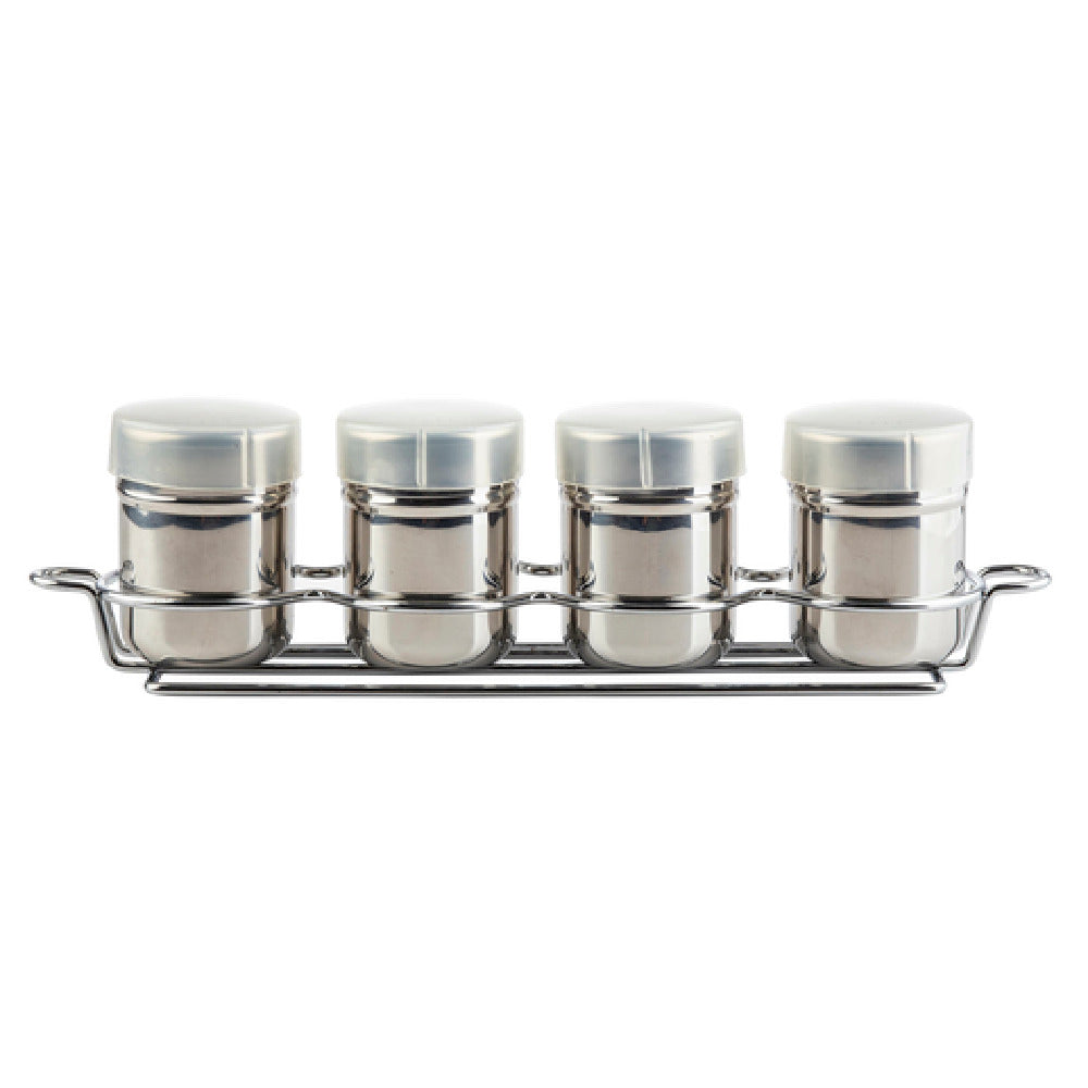 The Tablecraft 11055 Shaker Set is a versatile collection for culinary professionals, featuring four 6 oz. imprint shakers: "Cinnamon," "Cocoa," "Vanilla," and "Nutmeg." This set is designed for efficiency and convenience in both professional and home kitchens. Each shaker is crafted from durable stainless steel, ensuring long-lasting use and resistance to corrosion. The set includes a chrome-plated rack, providing an organized and aesthetically pleasing display that fits seamlessly into any kitchen environment. All components are dishwasher safe, making for easy cleaning and maintenance, a significant benefit in busy culinary settings. The unique imprints allow for easy identification and use of spices, enhancing the efficiency of food preparation. This shaker set is ideal for diverse market segments within the food industry, from high-end restaurants looking to maintain a polished presentation, to cafes and bistros that require reliable tools for quick service. Furthermore, it serves as a valuable asset in educational culinary institutions, where precision and organization are crucial. The Tablecraft 11055 Shaker Set combines practicality with style, ensuring it meets the demands of various culinary applications with ease and elegance.