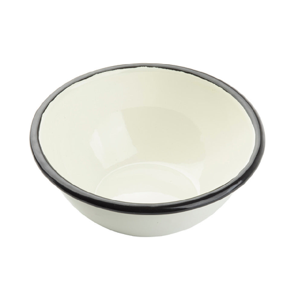 The Tablecraft 11152 Enamelware Collection™ Bowl 24 Oz 6-1/4"L x 6-1/4"W x 2-3/4"H is a versatile piece that seamlessly combines functionality with aesthetic appeal. Constructed with vitreous porcelain enamel over steel, this bowl is distinguished by its robust durability and elegant design, which features a striking black and white color scheme. Its round shape and 24-ounce capacity make it an ideal choice for various settings, from professional kitchens to home dining environments. The dimensions of 6-1/4 inches in length and width, along with a height of 2-3/4 inches, provide ample space for serving a range of dishes, making it suitable for different culinary segments. The enamel coating not only enhances its visual appeal but also ensures resistance to heat and scratches, extending its longevity and maintaining its luster. Perfect for restaurants, catering services, and home use, the Tablecraft 11152 bowl is a practical and stylish addition to any table setting, offering a unique blend of traditional craftsmanship and contemporary design. Its quality construction and versatile size make it a valuable asset for serving, mixing, and presenting food with elegance and efficiency.