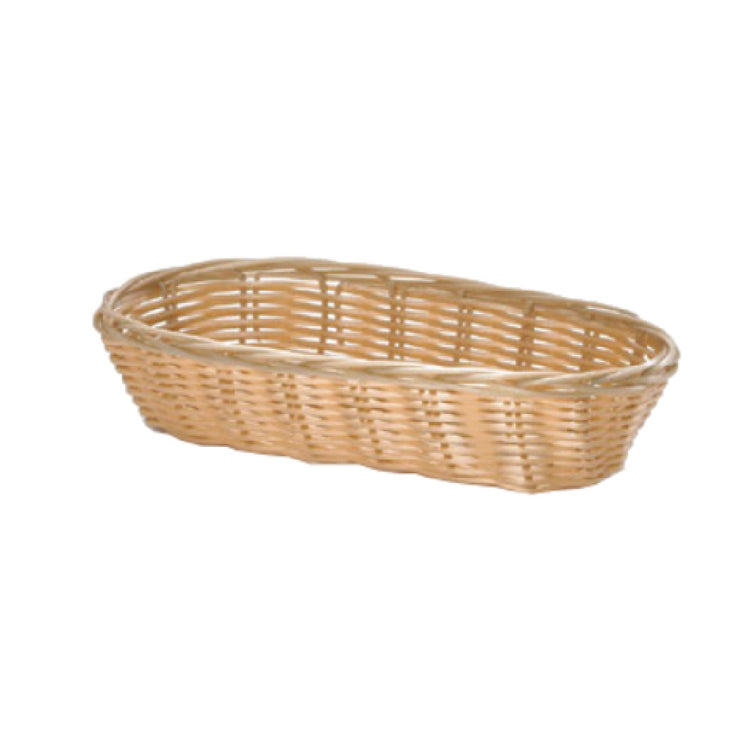 The Tablecraft 1117W Basket is a versatile and elegantly designed storage solution with dimensions of 9 inches by 4 inches by 2-1/4 inches, making it an optimal choice for a variety of culinary settings. Crafted in an oblong shape, this basket combines functionality with aesthetic appeal. It is hand-woven, highlighting the attention to detail and craftsmanship that goes into its creation. Made from natural polypropylene, this material choice ensures durability and easy maintenance, making it suitable for both casual and professional environments. The use of polypropylene also provides a lightweight and resilient structure, ideal for frequent handling and transportation in bustling kitchen environments. The basket's natural finish adds a touch of rustic charm, making it an excellent addition to any table setting or food presentation. Its design and dimensions cater to both commercial and home use, offering a practical storage and serving option for bread, fruits, and other dry goods. The Tablecraft 1117W Basket stands out as a reliable, stylish, and functional accessory, meeting the diverse needs of different segment markets within the food service industry.