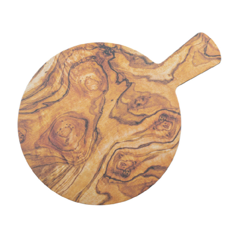 The Tablecraft 11183 Serving Paddle 10" Dia. Round is a versatile and durable serving accessory that is ideal for various dining settings. Featuring a 10-inch diameter round shape, it provides ample space to serve a range of dishes, from artisanal pizzas to elegant charcuterie boards. The paddle is equipped with a 4-1/2-inch handle, offering a comfortable grip for easy maneuverability during service. Made from high-quality melamine, this serving paddle boasts the attractive appearance of olive wood thanks to its detailed decal finish, all while ensuring the durability and ease of maintenance typical of melamine products. The sophisticated black color adds a touch of elegance, making it suitable for formal dining environments as well as casual eateries. This serving paddle caters to the needs of restaurants, catering businesses, and home entertainers who value both functionality and style in their serving tools. Its robust construction and design make it a practical choice for professionals seeking reliable performance and aesthetics in their serving ware.