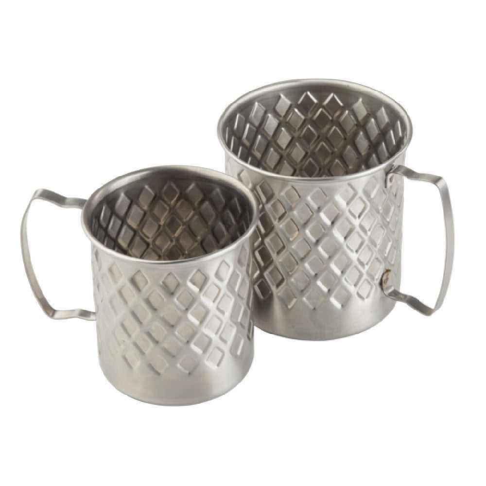 The Tablecraft 11657 Lattice Collection Mug is a versatile beverage container crafted from 200-series stainless steel, offering a perfect blend of durability and style. With dimensions of 4-3/4" x 3-1/2" x 3-5/8", this 14-ounce mug provides ample space for serving a variety of hot and cold beverages, making it an ideal choice for both home and professional settings. The elegant lattice design adds a touch of sophistication, making it suitable for casual gatherings or formal occasions. Its sturdy construction ensures long-lasting performance, meeting the demands of busy cafes, restaurants, and catering services. Additionally, the ergonomic design of the mug ensures comfortable handling and ease of use. The Tablecraft 11657 Lattice Collection Mug's versatility extends to its ability to maintain the temperature of beverages, making it a preferred option for coffee shops and tea houses. This mug embodies a practical and stylish solution for beverage presentation, catering to a wide range of market segments within the hospitality industry. Whether utilized in a bustling restaurant or a cozy home kitchen, the Tablecraft 11657 Lattice Collection Mug stands out as a reliable and attractive choice for serving drinks in any setting.