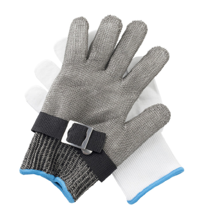 The Tablecraft 11739 Cut-Resistant Glove Large 9-1/4" X 7-1/4" X 1/4" is a meticulously designed safety gear ideal for a variety of industrial applications. This single glove showcases a woven stainless steel construction, offering superior cut resistance and durability. The dimensions of the glove, 9-1/4 inches in length, 7-1/4 inches in width, and 1/4 inch in thickness, ensure it fits comfortably on larger hands, providing ample coverage for comprehensive protection. The glove features a distinctive blue cuff that not only enhances its visibility but also signifies its large size, making it easily identifiable in a busy work environment. Additionally, it comes with a white protective glove included, which can be used as an inner layer to increase comfort and hygiene. This cut-resistant glove is particularly beneficial in sectors such as food processing, metalworking, and any industry where hand protection from sharp objects is essential. Its robust construction ensures longevity and reliability, offering peace of mind to professionals who demand the highest standards of safety. The Tablecraft 11739 glove is an indispensable tool for ensuring workplace safety and efficiency, embodying a perfect blend of protection, functionality, and ergonomic design.