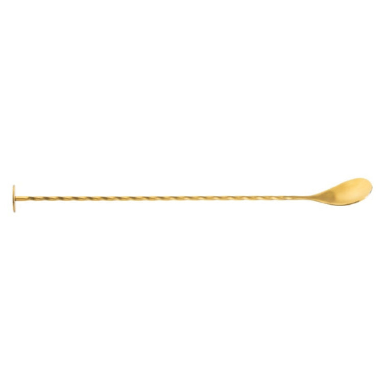 The Tablecraft 11816 Bar Spoon is an elegantly designed utensil crafted from 18/8 stainless steel, known for its excellent resistance to corrosion and staining. Measuring 11 inches (28 cm) in length, this bar spoon is both versatile and functional, making it a quintessential tool for professional bartenders and cocktail enthusiasts alike. Its length allows for easy stirring in tall glasses and pitchers while maintaining a comfortable grip. The spoon's durable construction ensures longevity and reliability, even with frequent use in high-demand environments. The gold finish adds a touch of sophistication, making it not only a practical tool but also an attractive accessory to complement any bar setting. This bar spoon is ideal for precision mixing of cocktails, allowing for the seamless blending of ingredients to enhance flavor profiles. Whether used in upscale bars, restaurants, or at-home cocktail setups, the Tablecraft 11816 Bar Spoon stands out as a premium choice for those seeking both functionality and aesthetic appeal in their barware collection.