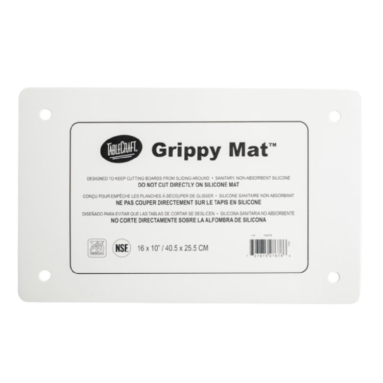 The Tablecraft 12074 Grippy Mat™ Cutting Board Mat is a versatile and essential kitchen accessory designed to enhance safety and efficiency in food preparation environments. Measuring 16"x10"x.075" and boasting a thickness of 2mm, this rectangular mat provides ample surface area for a variety of cutting tasks. Its standout feature is the anti-slip silicone imprinted surface, which ensures stability and prevents slipping during use, making it a practical choice for both professional chefs and home cooks. The white mat is both visually appealing and easy to integrate into any kitchen setup. Certified by the National Sanitation Foundation (NSF), the Tablecraft 12074 meets rigorous public health and safety standards, making it suitable for commercial kitchen use. As a Cash & Carry product, it is readily available for immediate purchase, adding convenience for busy culinary environments. This cutting board mat is an indispensable tool for those seeking to maintain a secure and efficient food preparation space, offering an ideal combination of size, material quality, and practical features tailored to meet the needs of diverse market segments within the food service industry.