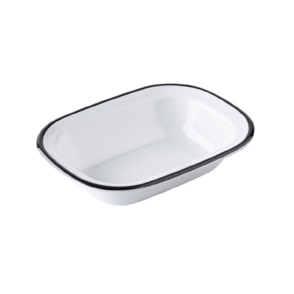 The Tablecraft 12083 Canteen Collection Serving Pan is a versatile and practical addition to any food service setting, with a capacity of 18 oz., making it suitable for a variety of portion sizes. Measuring 7.75 inches by 5.75 inches with a height of 1.75 inches, it offers ample space for serving a range of culinary creations. Crafted from durable melamine, this rectangular pan combines robust construction with a sleek aesthetic, featuring a classic white and black color scheme that complements diverse table settings. Its melamine composition ensures the serving pan is lightweight yet resilient, providing a long-lasting solution for both high-volume commercial kitchens and intimate dining experiences. This serving pan is ideal for restaurants, catering events, and buffet presentations, where functionality and style are paramount. The thoughtful design facilitates easy handling and stacking, optimizing space efficiency and ensuring seamless service delivery. The Tablecraft 12083 Canteen Collection Serving Pan stands out as a reliable choice for professionals seeking a harmonious blend of durability, practicality, and elegance in their tabletop presentations.