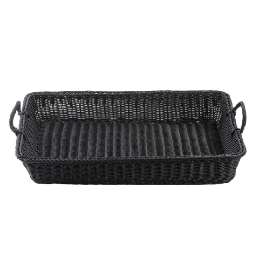 The Tablecraft 12133 Handwoven Basket 23.5" X 15" X 5.5" Rectangular is a meticulously crafted storage solution designed to cater to various market segments in the hospitality and home industries. Measuring 23.5 inches in length, 15 inches in width, and 5.5 inches in height, this basket provides ample space for holding items, making it perfect for buffet displays, catering events, or home organization. The rectangular shape, along with the inclusion of handles, enhances its practicality by allowing for easy transportation and versatile placement in different settings. Constructed from durable polypropylene, this basket is not only lightweight but also resistant to moisture and stains, ensuring longevity and ease of maintenance. The handwoven design adds a touch of elegance and sophistication, making it suitable for both casual and upscale environments. Available in a sleek black finish, it seamlessly blends with various decor styles, enhancing the aesthetic appeal of the space. The Tablecraft 12133 basket is an ideal choice for professionals in the food service industry looking for reliable and stylish serving solutions, as well as for homeowners who appreciate functional and decorative storage options.