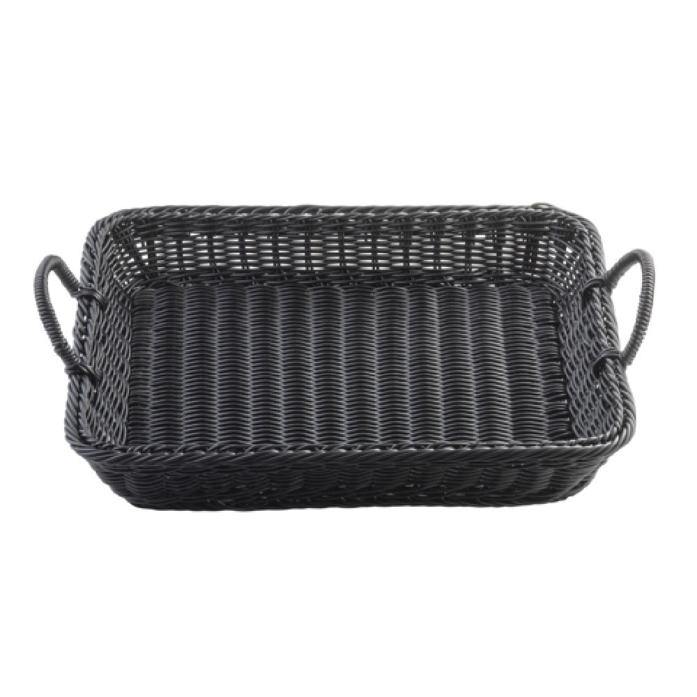 The Tablecraft 12135 Handwoven Basket 15.5" x 12.5" x 4.75" Rectangular is a versatile storage solution, meticulously crafted for both aesthetic appeal and practical functionality. This handwoven basket is designed with a spacious interior measuring 15.5 inches in length, 12.5 inches in width, and 4.75 inches in height, making it an ideal choice for organizing a variety of items. Constructed from durable polypropylene, it offers the appearance of traditional weaving while ensuring resilience against wear and tear. The basket's black coloration provides a sleek and modern aesthetic, suitable for diverse settings, from home use to commercial environments such as restaurants and retail displays. Equipped with convenient handles, this basket facilitates easy transportation and repositioning, enhancing its utility in dynamic spaces. The Tablecraft 12135 is particularly valuable in food service industries for presenting bread, fruits, or other items elegantly, while its robust construction supports repeated and varied applications. Its unique design and material make it an attractive option for businesses aiming to combine practicality with style in their display or storage solutions.
